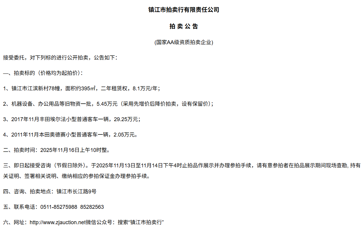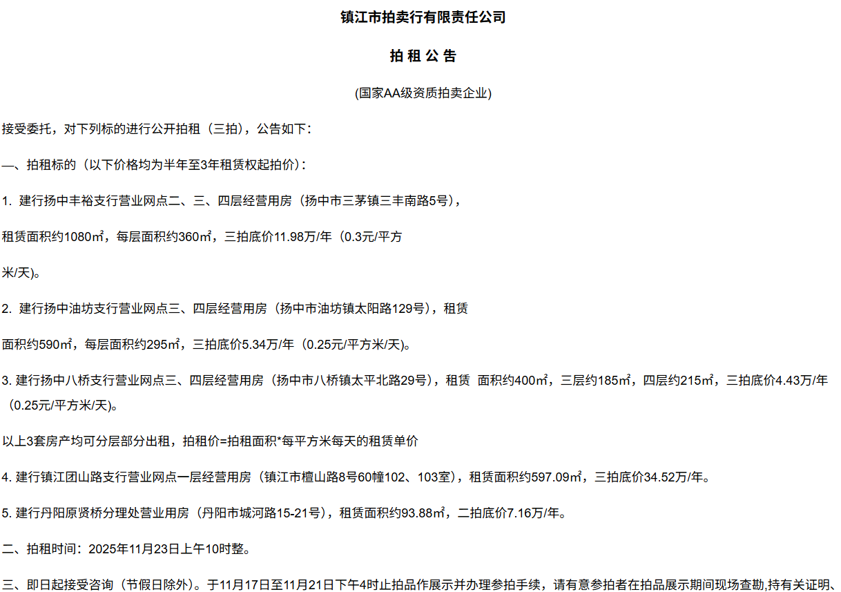 鎮(zhèn)江市拍賣行有限責任公司拍 租 公 吿(國家AA級資質拍賣企業(yè))接受委托,對下列標的進行公開拍租(三拍),公告如下:—、拍租標的(以下價格均為半年至3年租賃權起拍價):1.  建行揚中豐裕支行營業(yè)網(wǎng)點二、三、四層經(jīng)營用房(揚中市三茅鎮(zhèn)三豐南路5號),租賃面積約1080㎡,每層面積約360㎡,三拍底價11.98萬/年(0.3元/平方米/天)。2.  建行揚中油坊支行營業(yè)網(wǎng)點三、四層經(jīng)營用房(揚中市油坊鎮(zhèn)太陽路129號),租賃面積約590㎡,每層面積約295㎡,三拍底價5.34萬/年(0.25元/平方米/天)。3. 建行揚中八橋支行營業(yè)網(wǎng)點三、四層經(jīng)營用房(揚中市八橋鎮(zhèn)太平北路29號),租賃  面積約400㎡,三層約185㎡,四層約215㎡,三拍底價4.43萬/年(0.25元/平方米/天)。以上3套房產均可分層部分出租,拍租價=拍租面積*每平方米每天的租賃單價4. 建行鎮(zhèn)江團山路支行營業(yè)網(wǎng)點一層經(jīng)營用房(鎮(zhèn)江市檀山路8號60幢102、103室),租賃面積約597.09㎡,三拍底價34.52萬/年。5. 建行丹陽原賢橋分理處營業(yè)用房(丹陽市城河路15-21號),租賃面積約93.88㎡,二拍底價7.16萬/年。二、拍租時間:2025年11月23日上午10時整。三、即日起接受咨詢(節(jié)假日除外)。于11月17日至11月21日下午4時止拍品作展示并辦理參拍手續(xù),請有意參拍者在拍品展示期間現(xiàn)場查勘,持有關證明、簽署相關說明、繳納相應的參拍保證金辦理參拍手續(xù)。四、咨詢、拍租地點:鎮(zhèn)江市長江路9號五、聯(lián)系方式:0511-85275988   13655299933楊先生六、網(wǎng)址:http://www_zjauction_net.crpp.net;微信公眾號:搜索“鎮(zhèn)江市拍賣行” 拍品清單2025.11.23序號名稱起拍價(元)標的說明1建行揚中豐裕支行營業(yè)網(wǎng)點二、三、四層經(jīng)營用房(揚中市三茅鎮(zhèn)三豐南路5號),租賃面積約1080㎡,每層面積約360㎡三拍底價11.98萬/年(0.3元/平方米/天)1、1-3號房產均可分層部分出租,拍租價=拍租面積*每平方米每天的租賃單價;2、意向競拍人在拍賣前需持營業(yè)執(zhí)照或身份證與委托方說明租賃房產經(jīng)營業(yè)態(tài),確定意向后出具房產承租用途承諾書,經(jīng)委托方審核后,方可交納保證金參加競拍;3、租賃期限為半年至3年(承租方與出租方協(xié)商而定),承租方每半年或一年結付租金,租賃期間的水、電費用及其它相關費用均由承租方承擔;4、承租方不得用于經(jīng)營和保管危險物品,不得用于開設餐飲、娛樂等可能嚴重影響消防安全、運營安全的經(jīng)營業(yè)態(tài),不得用于經(jīng)營委托貸款、小額貸款等可能冒用委托方名義,帶來聲譽風險的經(jīng)營業(yè)態(tài)。租賃期內,承租方不得破壞墻體結構,自行成就消防、安全等使用條件,不得擅自將租賃房屋轉租、轉讓給他人使用,否則委托方有權收回房屋;5、拍租成交后,承租方將租金交至出租方指定賬戶,傭金交至拍賣方賬戶(拍租傭金為該房屋一個月租金)。承租方憑租賃合同無息退還保證金。2建行揚中油坊支行營業(yè)網(wǎng)點三、四層經(jīng)營用房(揚中市油坊鎮(zhèn)太陽路129號),租賃面積約590㎡,每層面積約295㎡三拍底價5.34萬/年(0.25元/平方米/天)3建行揚中八橋支行營業(yè)網(wǎng)點三、四層經(jīng)營用房(揚中市八橋鎮(zhèn)太平北路29號),租賃面積約490㎡,每層面積約245㎡三拍底價4.43萬/年(0.25元/平方米/天)4建行鎮(zhèn)江團山路支行營業(yè)網(wǎng)點一層經(jīng)營用房(鎮(zhèn)江市檀山路8號60幢102、103室),建筑面積約597.09㎡三拍底價34.52萬/年5建行丹陽原賢橋分理處營業(yè)用房(丹陽市城河路15-21號),建筑面積約93.88㎡二拍底價7.16萬/年